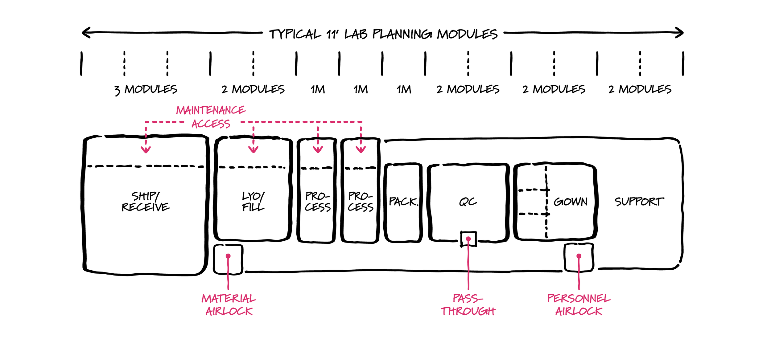 With futureproofing in mind, the spatial components of production suites can be organized on lab planning modules, allowing space for expansion to meet a different regulatory requirement, material flow, or process. This also allows for production, process development, and research lab areas to ebb and flow with the demands of production.