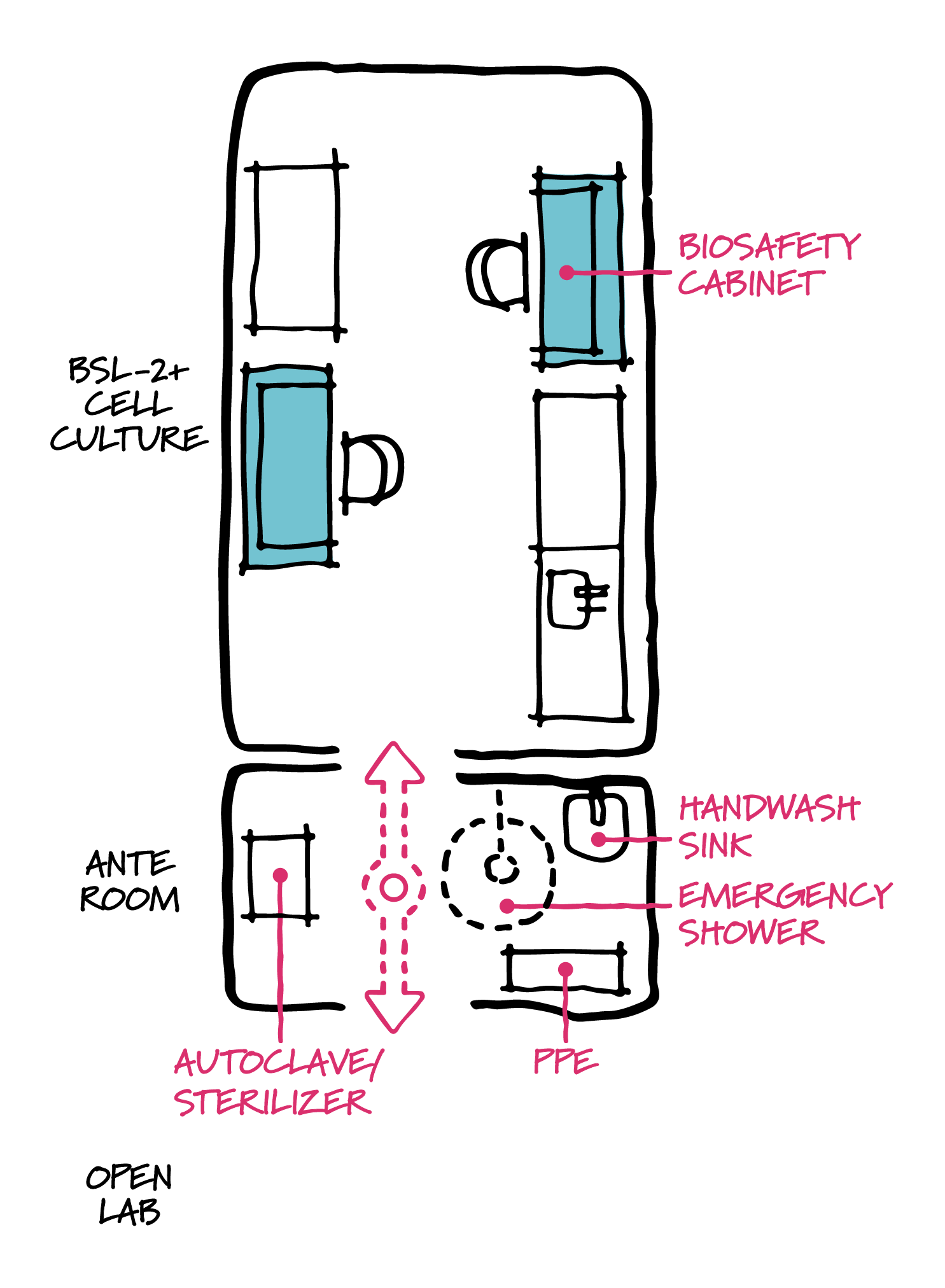 How does this affect lab design? Protocols for safe handling of these types of viruses generally prohibit work on open benches in the lab. Additional safety considerations include biosafety cabinets for manual processes, as well as additional safety considerations. To address this growing need, many research programs and institutions have developed standards for dedicated BSL-2+ suites—environments with features and protocols more advanced than NIH Biological Safety Level 2 (BSL-2) labs most typical to biotech and pharmaceutical research, though not as onerous to build and operate as labs designed for aerosolized pathogens (typically BSL-3).