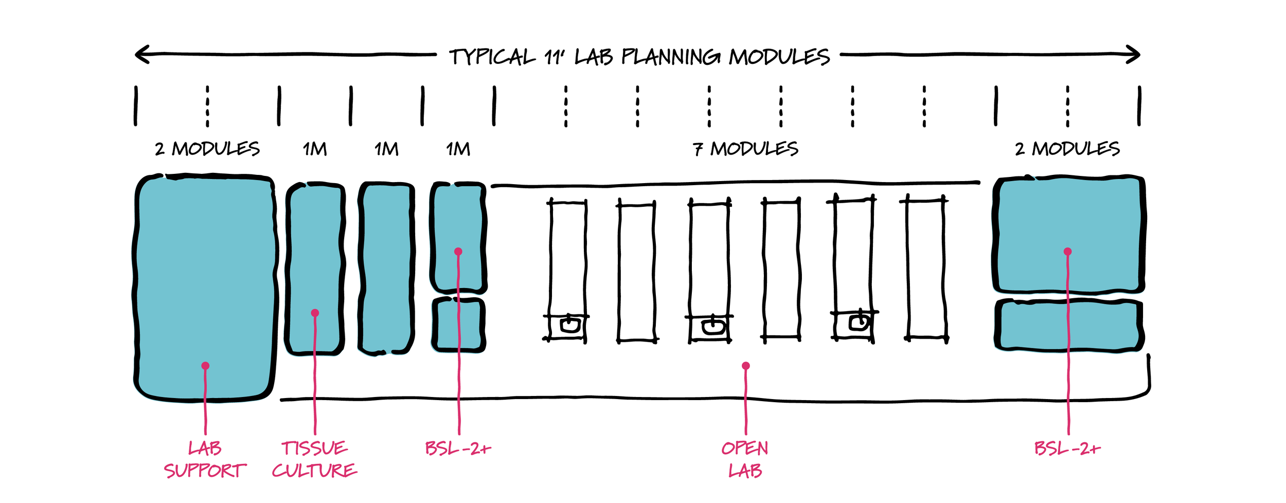 Flexibility is paramount in this new lab design paradigm. The ability to pivot labs to new demands as current priorities fade will be based on more modular planning. A central philosophy of modular lab planning is that floorplates are organized on a regular module (often 11 ft. x 30 ft., with many variations) so that open labs and lab support can expand and contract without major modifications. A planning module accounts for the space of the lab bench, the open aisle behind it, and the lab bench on the other side of the aisle. The module should be flexible to allow a range of scenarios—such as replacement of a lab bench with a chemical fume hood, or separation of spaces with walls for a tissue culture room and other lab support.