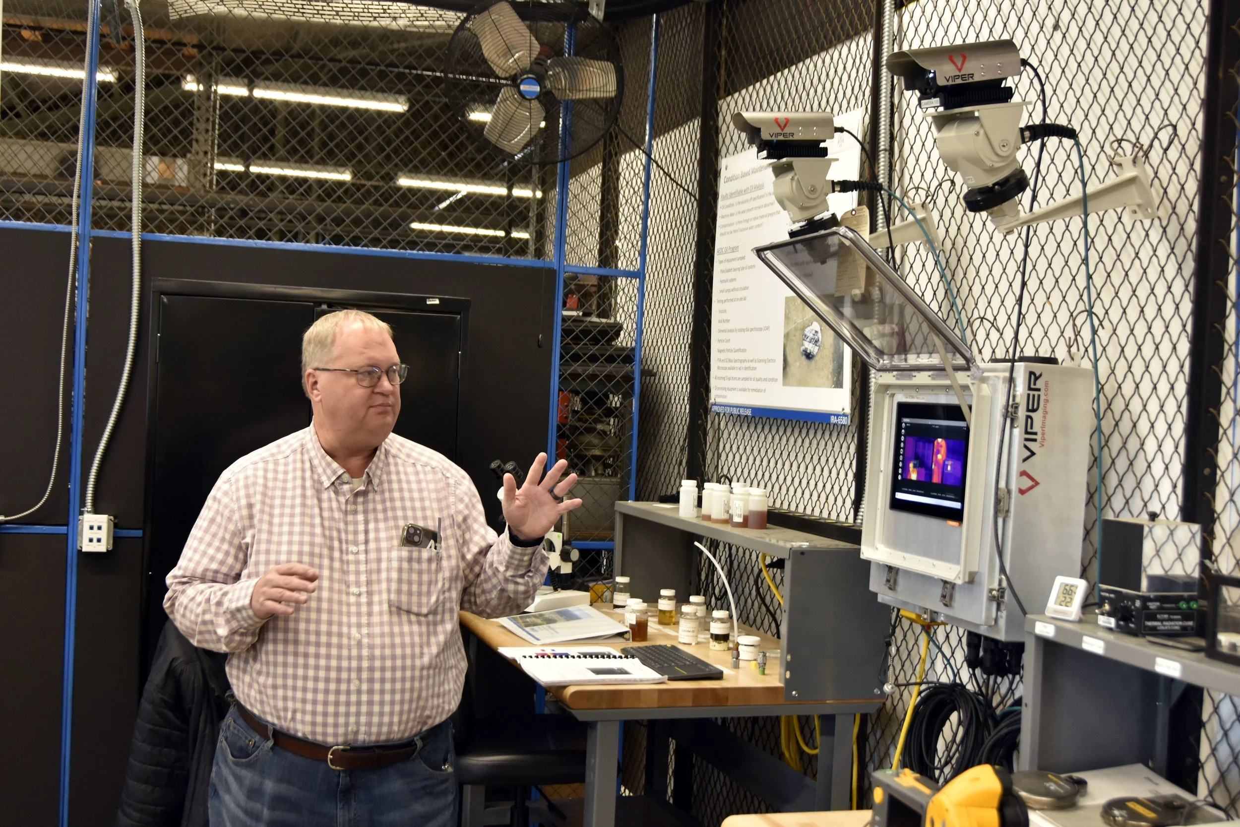Dan Henley, a predictive maintenance manager at Arnold Air Force Base, discusses the infrared camera project for which he was awarded Arnold Engineering Development Complex Innovation Spark Tank program funding in early 2024. The system is currently on display in the Innovation Lab at Arnold AFB in Tennessee, and Henley demonstrated the capability during a Dec. 12, 2024, tour of the facility given for Airmen at Arnold. The Innovation Lab was recently reopened following a renovation, and the facility features 3D printing and scanning capabilities, a computer lab, an environmental chamber, a shock tube and a small-scale wind tunnel. Image: US Air Force photo by Bradley Hicks
