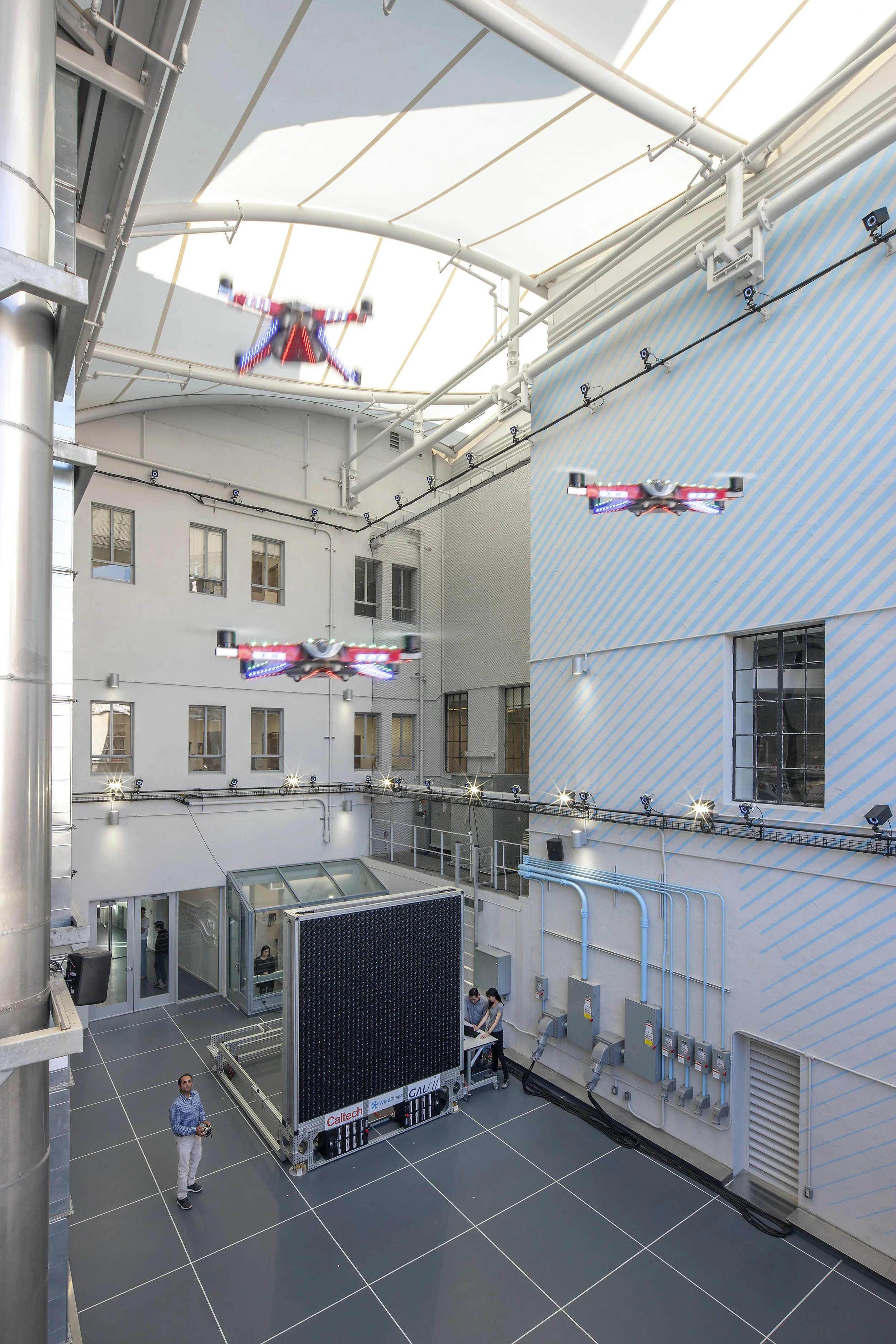 Caltech’s CAST lab had an incredible amount of back-and-forth between the faculty and design team to update a 1940s building for robotics and autonomous technologies. The building’s courtyard was converted into an outdoor wind tunnel, complete with movable fan wall for simulating autonomous drone navigation in inclement weather. Photographer: Tom Bonner