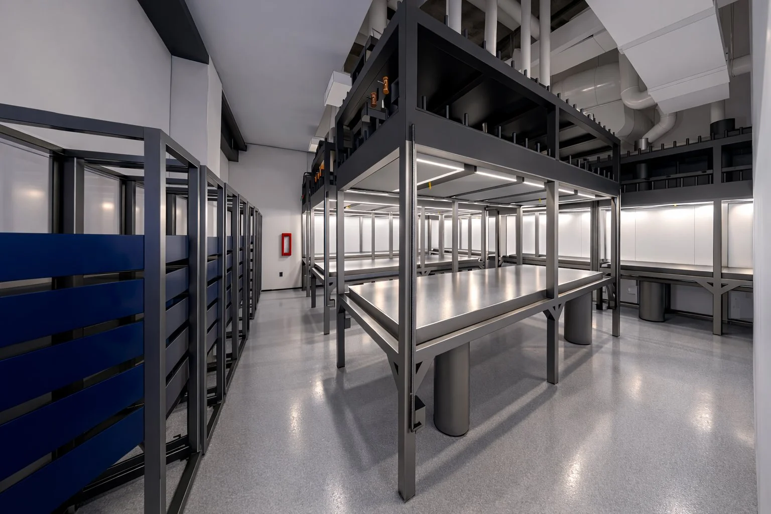 Apparatus Scale—Room Temperature: Recent discoveries and novel materials are enabling the design of quantum computers that can operate at room temperatures, but still within tightly controlled conditions. In this approach, multiple tiers of customized lasers and electronic components are assembled onto optics tables contained within light-tight enclosures (essentially a room-within-a-room). These are custom-designed in collaboration with the researchers and our engineers to provide clean HEPA-filtered air at 72ºF that is maintained within +/- 0.1ºF. Achieving this extreme level of environmental precision in a lab containing as many as eight enclosures requires that each be served by a dedicated air handling unit, with a separate thermostatic control for each enclosure.
