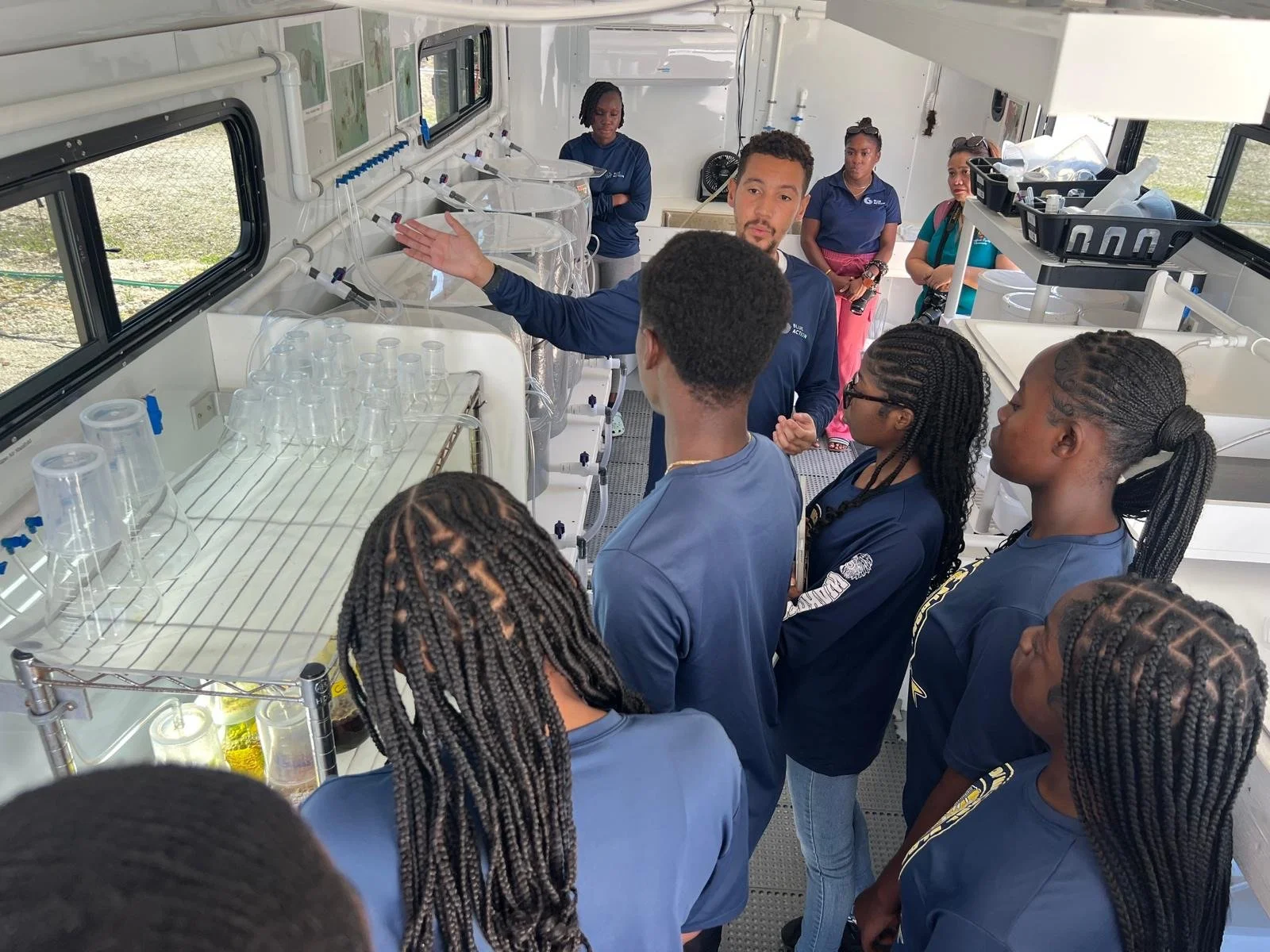 Grand Bahama Queen Conch Mariculture Center. Kristian Moree, aquaculture technician, shows local high school students the Mobile Lab. Image credit: Tony Johns