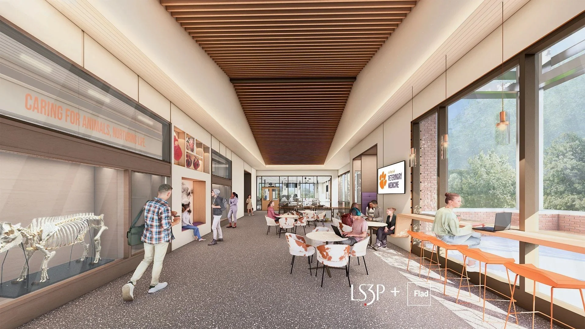 The design of Clemson University's Harvey S. Peeler Jr. College of Veterinary Medicine incorporates the needs of South Carolina's veterinary community, addressing the state's veterinarian shortage and tailoring teaching spaces to prepare students for diverse animal healthcare practices. Image: Courtesy of LS3P + Flad
