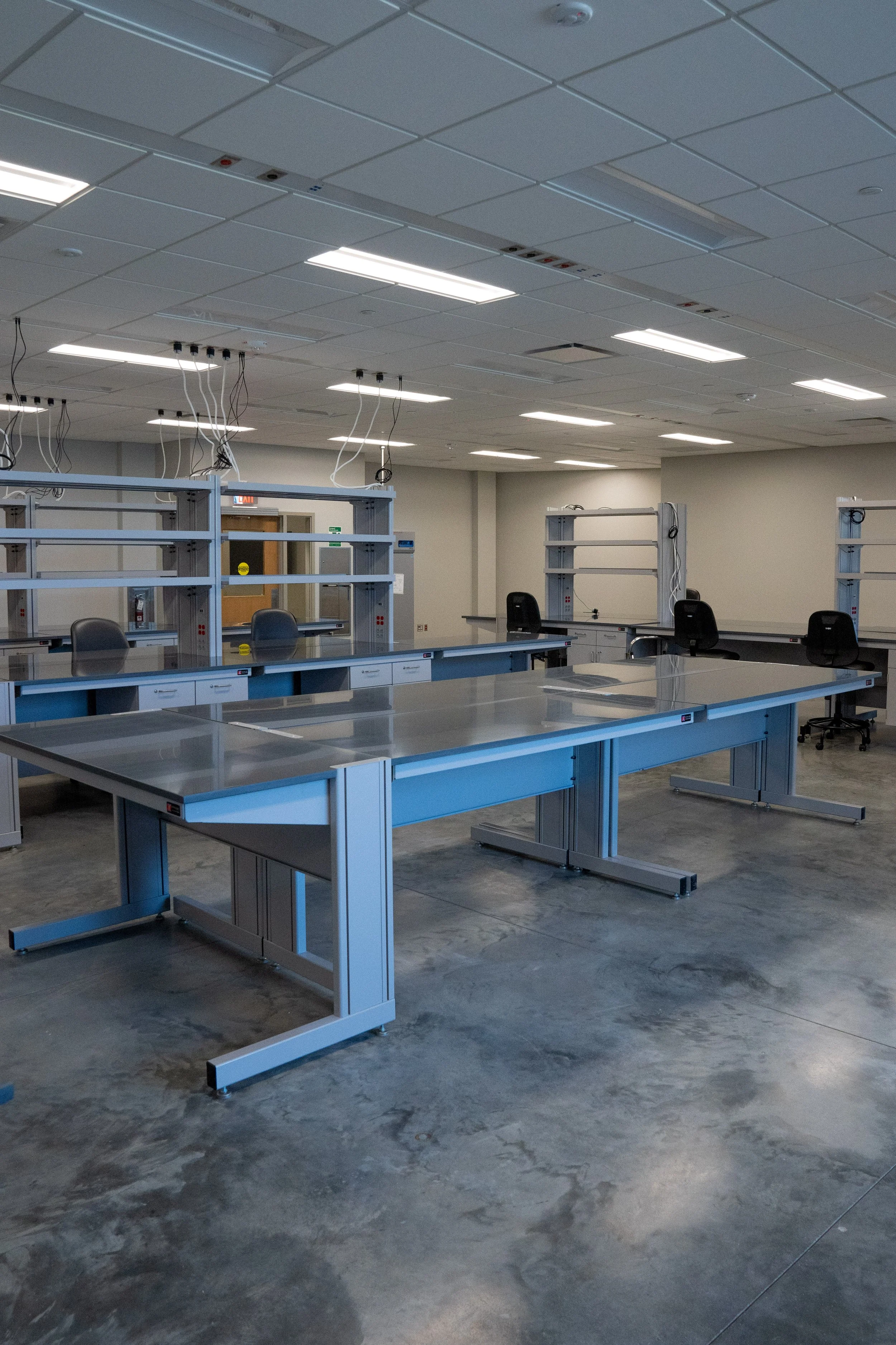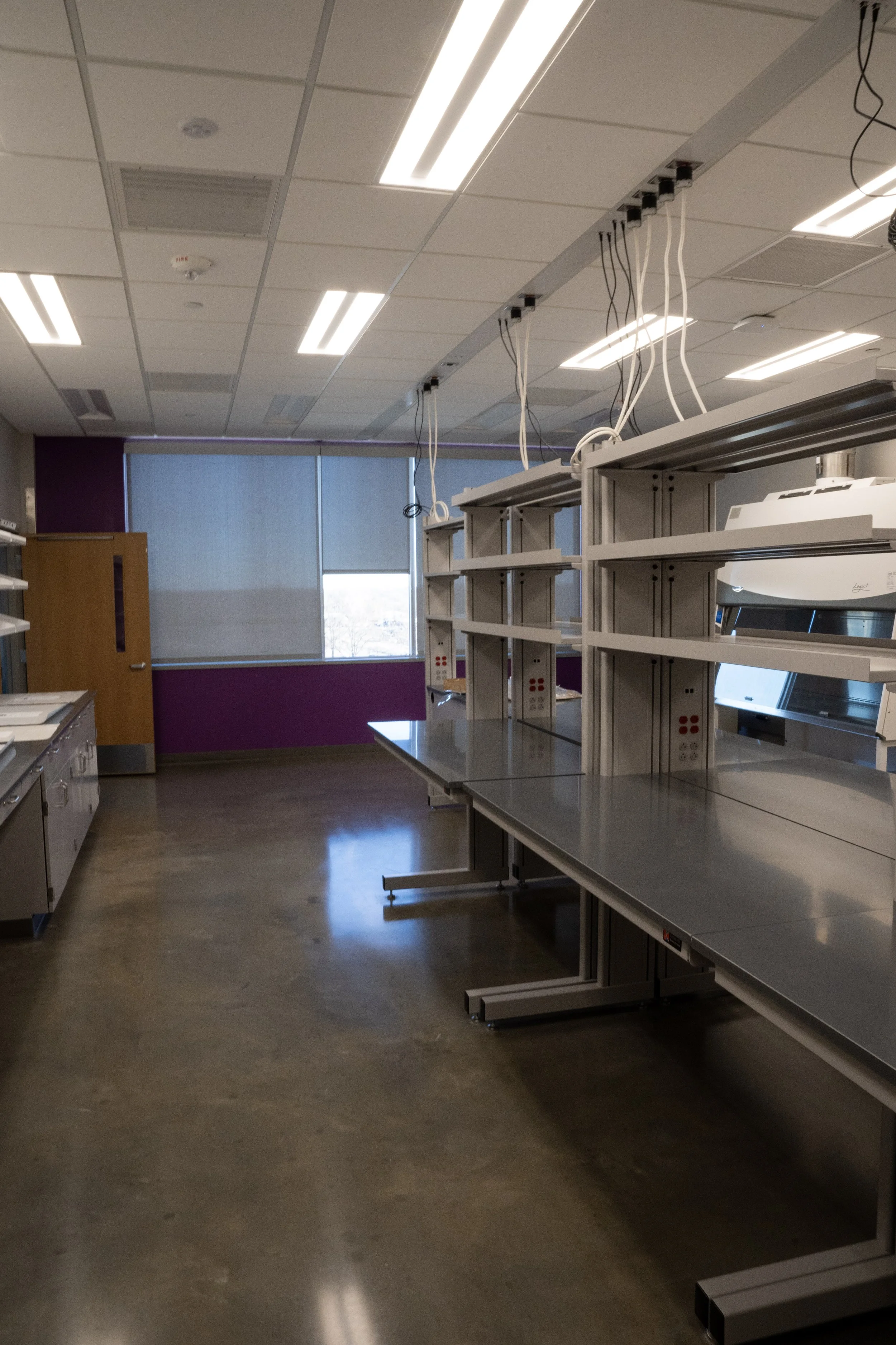 Space for future expansion, wide bright hallways, large windows throughout the labs, extra spacious benches, mobile cabinets and benches for reconfiguration if needed