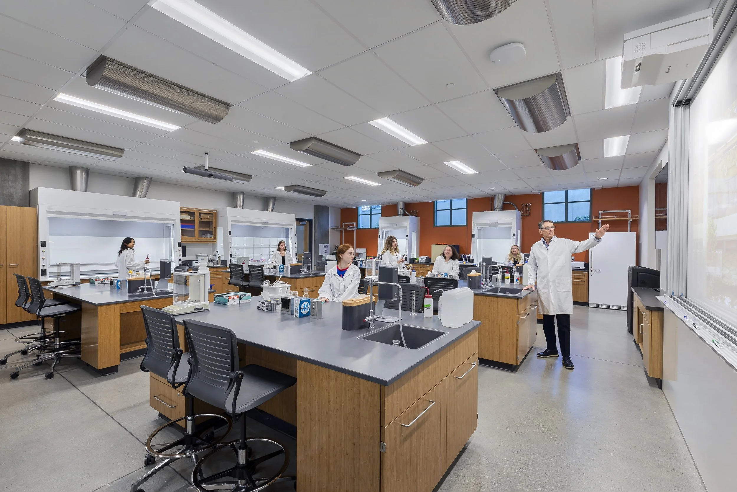 High-efficiency glazing, daylight sensors, and operable windows complement these systems, supporting the facility’s pursuit of LEED BD+C Gold certification while reducing energy use relative to comparable science buildings.