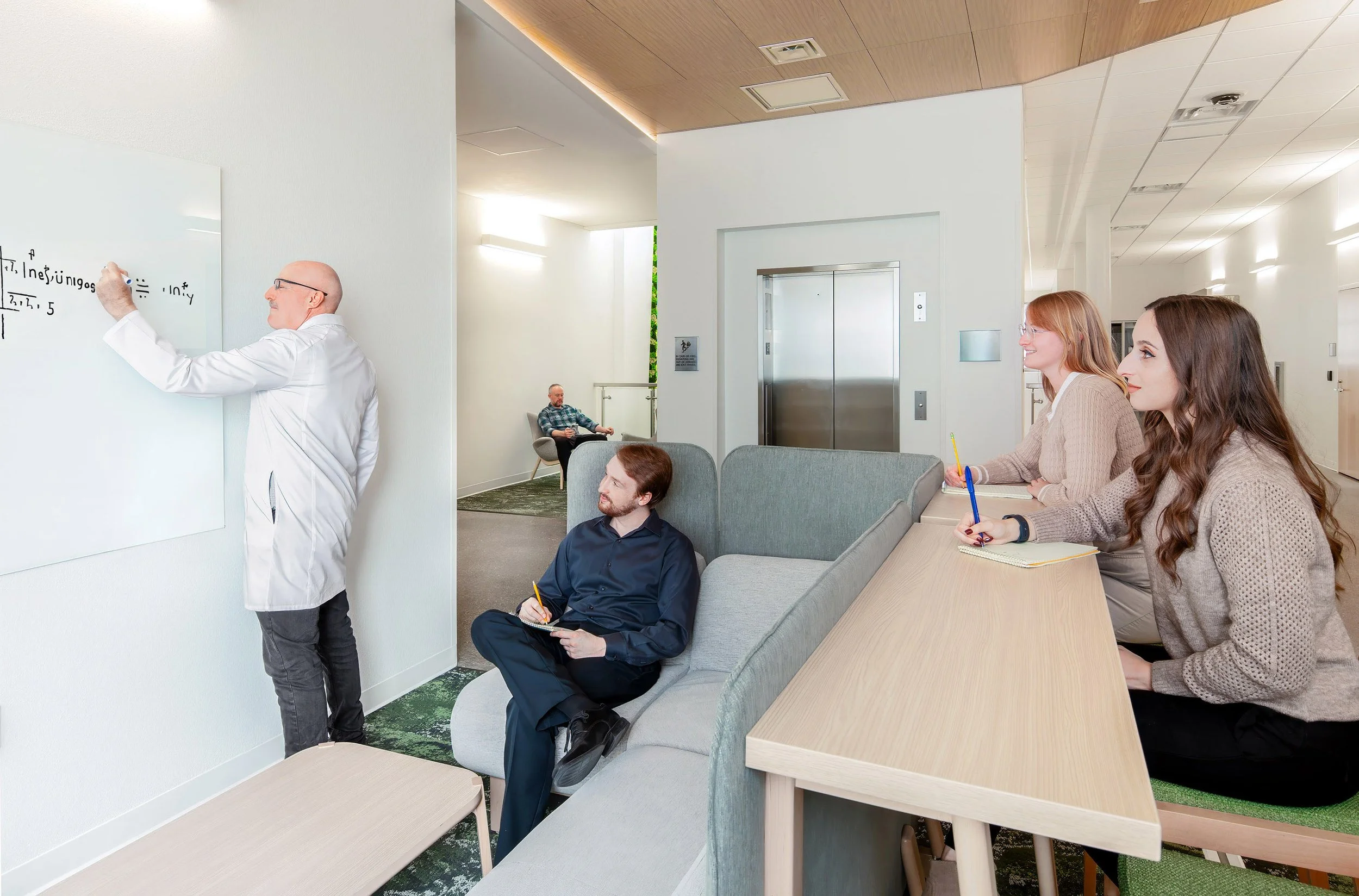 A: Access to nature was integrated early in the design process and exists in the facility where scientists work today. The occupants have a two-story lobby with a living wall, views to distant mountains from labs and offices, and direct access to outdoor spaces without having to leave the facility. Collaboration zones were intentionally placed to encourage occupant interaction in a field that often isolates workers. Keeping scientists separated from necessary disruptions helps to reduce mental fatigue. Though subtle, the isolation of mechanical equipment was important to reduce imperceivable noise and vibration to interior spaces. Not so subtle was the reduced noise and vibration impact from the indoor firing range and water tank room. Meticulous attention to detail and engagement with staff of the existing facility ensured that each lab space was optimized for its highly specific use, while minimizing interruptions to adjacent labs.