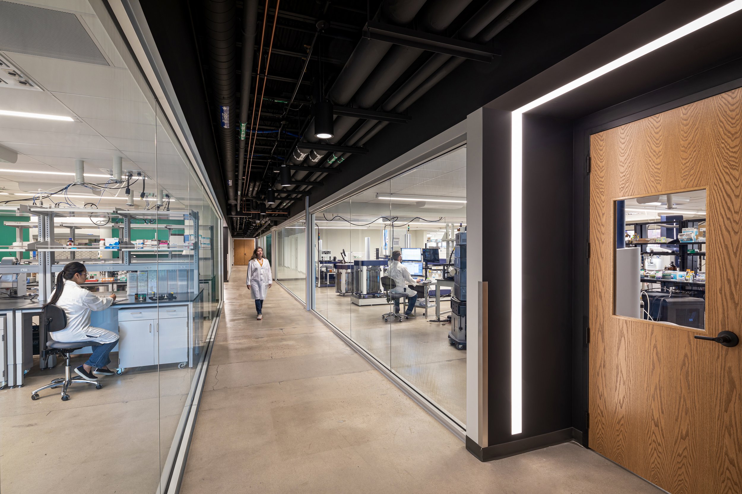 Expansive corridors with full glass walls foster connectivity and transparency, offering a clear view into the heart of discovery within the lab spaces. Image: Caleb Tkach, AIAP