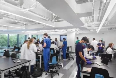 The exterior is now energy-efficient using a glazed curtain wall system with stone and metal panels. The inside offers large, reconfigurable learning studios, flexible classrooms, multidisciplinary labs, and glass-enclosed collaboration spaces.