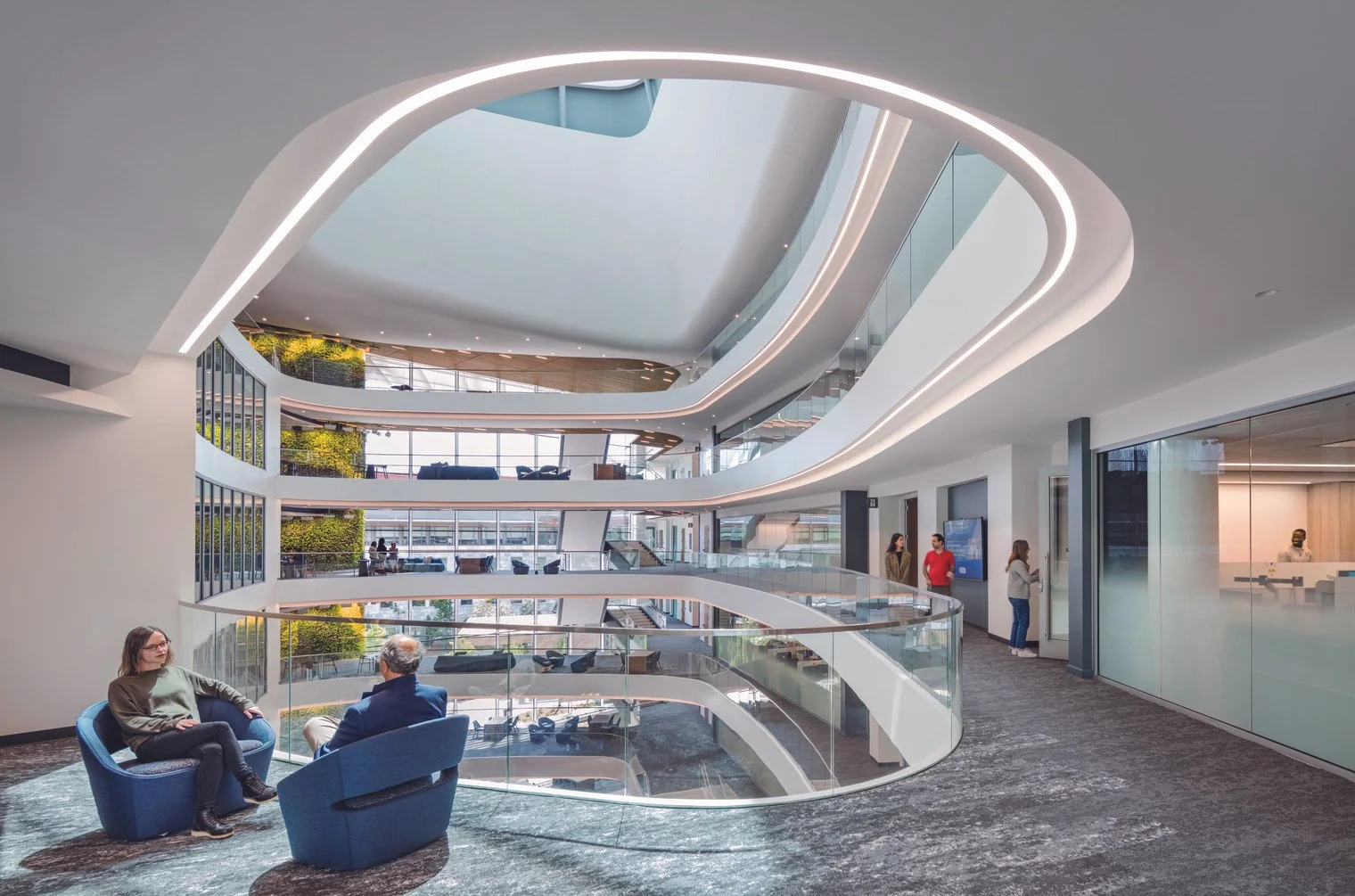 A soaring atrium—a central design and social feature—unites the towers both physically and experientially. Daylit through a 95-foot-long skylight engineered using advanced parametric modeling, the atrium invites collaboration through open staircases, informal meeting areas, digital media installations, and a five-story living green wall. The openness and visibility foster spontaneous interactions across specialties, promoting what Emory describes as “collision science.”