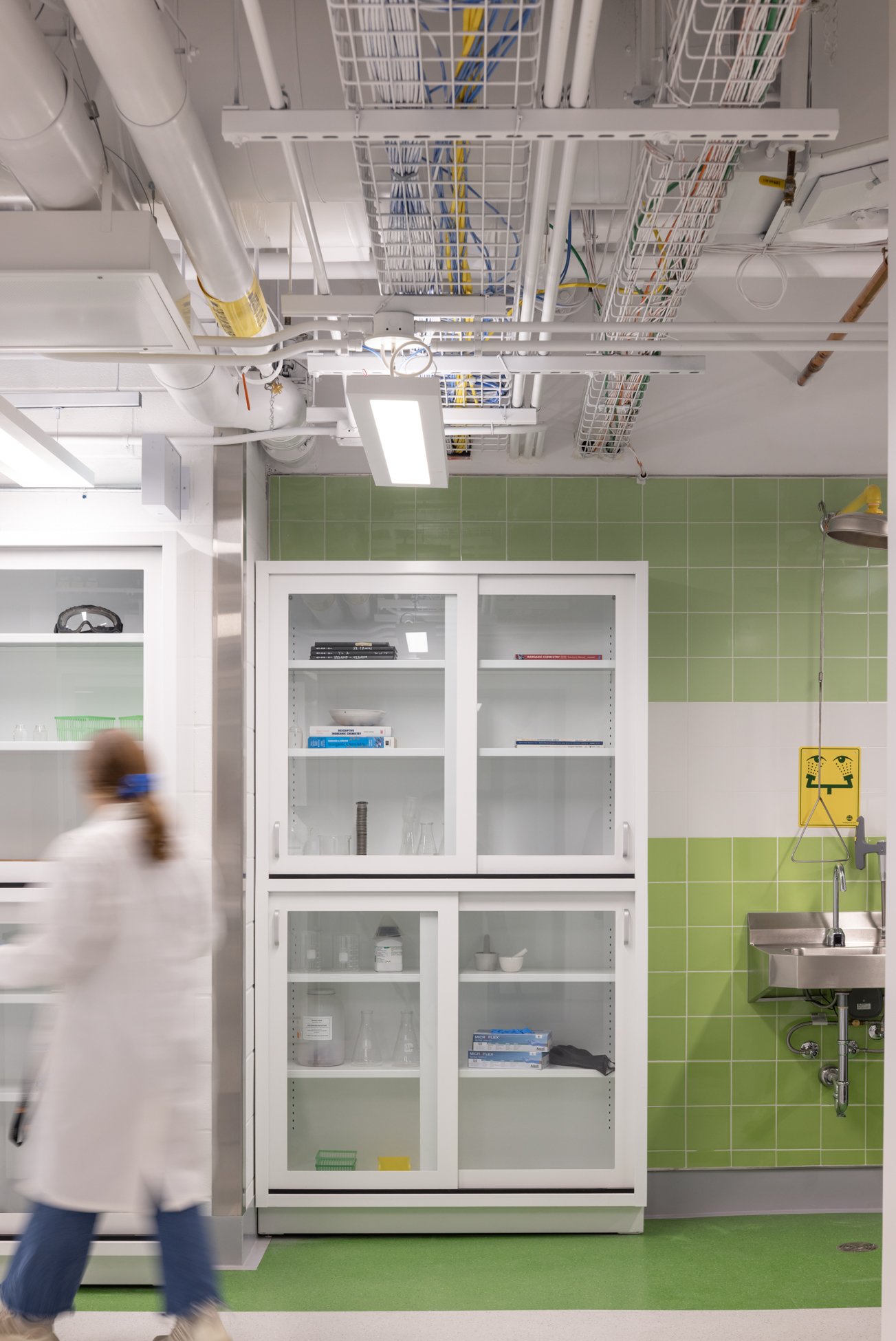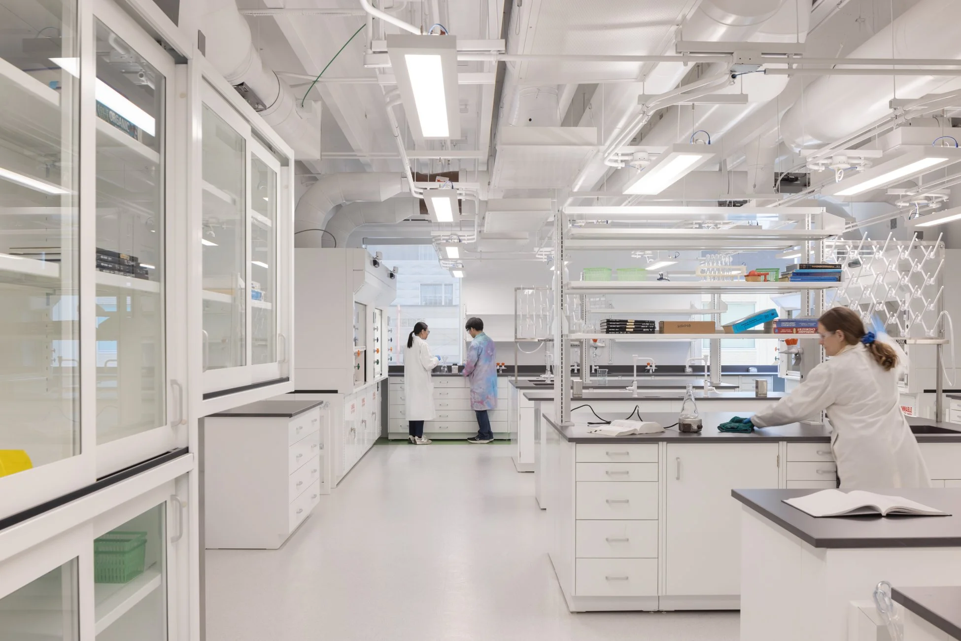 Standardized services and modular casework layouts were repeated across the eight laboratories, creating equitable spaces while allowing researchers to personalize their immediate work environments. This approach balances the efficiency of standardization with the flexibility to accommodate evolving scientific needs.