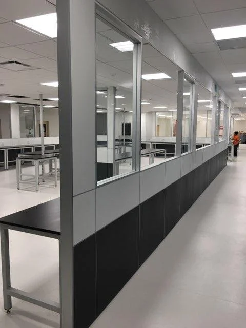 Prefabricated modular free-standing system in development for use in quickly transforming open spaces such as found in retail to laboratories.