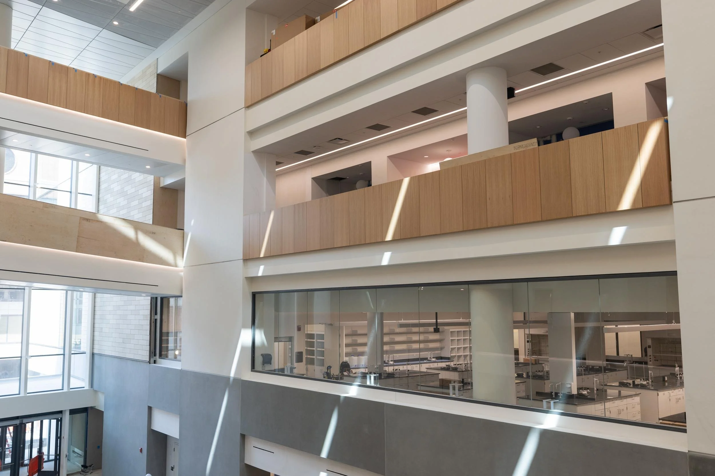The building now features open-bay research labs, student teaching labs, and centralized core facilities, including sensor and X-ray labs. These spaces are designed to encourage collaboration across departments through shared equipment and project opportunities. Hamilton notes that the design creates a social network among departmental representatives, promoting spontaneous interactions and cross-disciplinary projects.