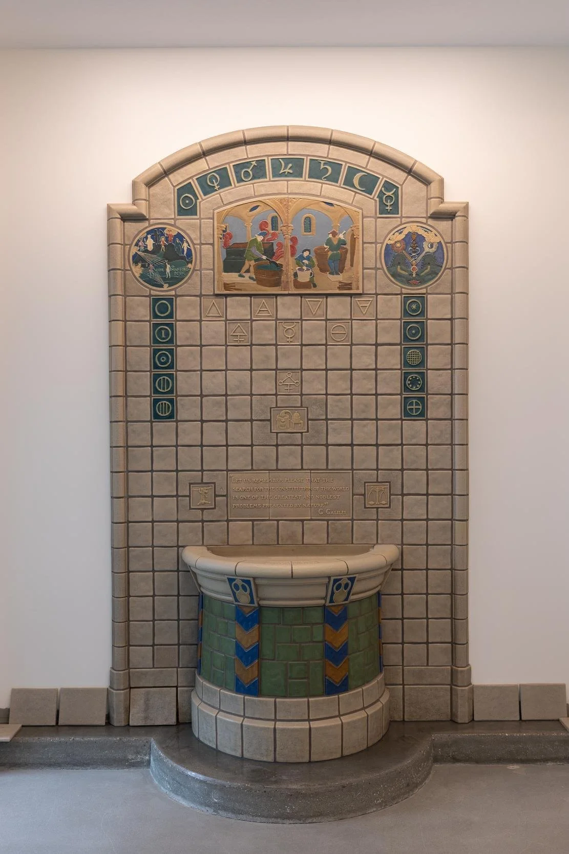 Preserving the historic character of Old Chem was a central goal of the renovation. Notable among the preserved elements is a century-old Rookwood fountain, meticulously relocated and reinstalled in a prominent location near the new atrium. Hamilton says, “Ensuring that the historical artifacts were preserved and integrated into the final project was a priority for the team. The Rookwood fountain was relocated within the existing building in a prominent place off the entry in order to accommodate a connection to the new atrium.”