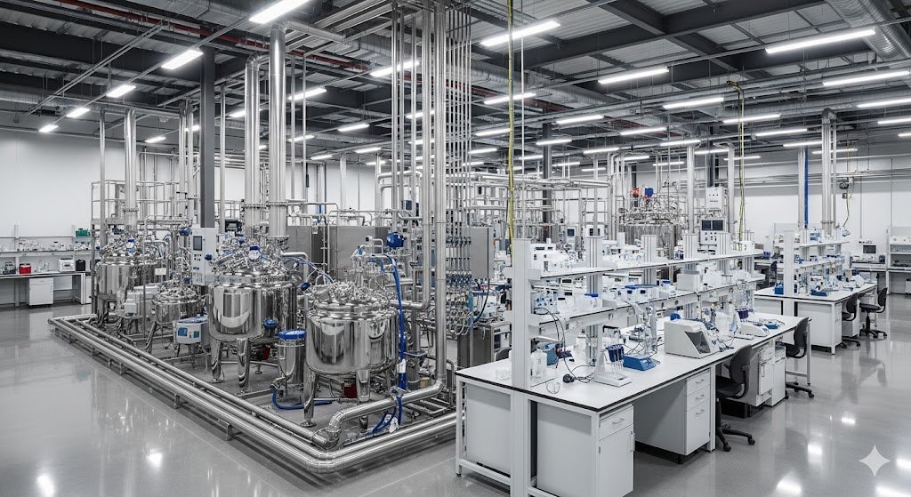 A modern scale-up facility acts as a structural bridge, blending the analytical precision of a clinical laboratory with the heavy utility demands of an industrial manufacturing floor. | Credit: Gemini (2026)