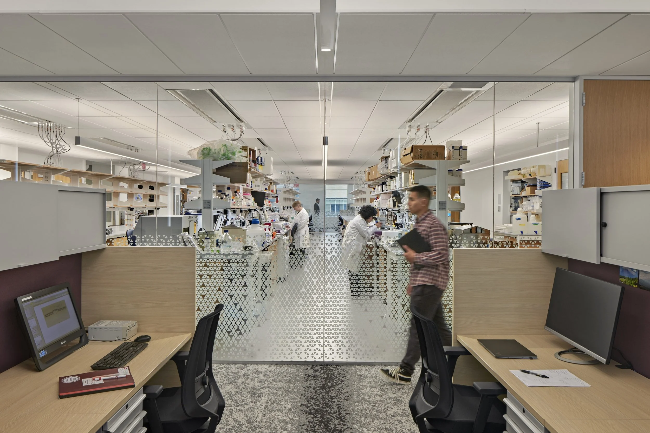 “The spatial plan organizes labs into distinct neighborhood groups, creating identifiable zones within the larger floor plate and offering more opportunities for collaboration,” Hamilton explains. “By locating office write-up areas immediately outside the labs, the design intentionally removes the traditional linear separation between offices and laboratory benches, fostering closer day-to-day interaction.”